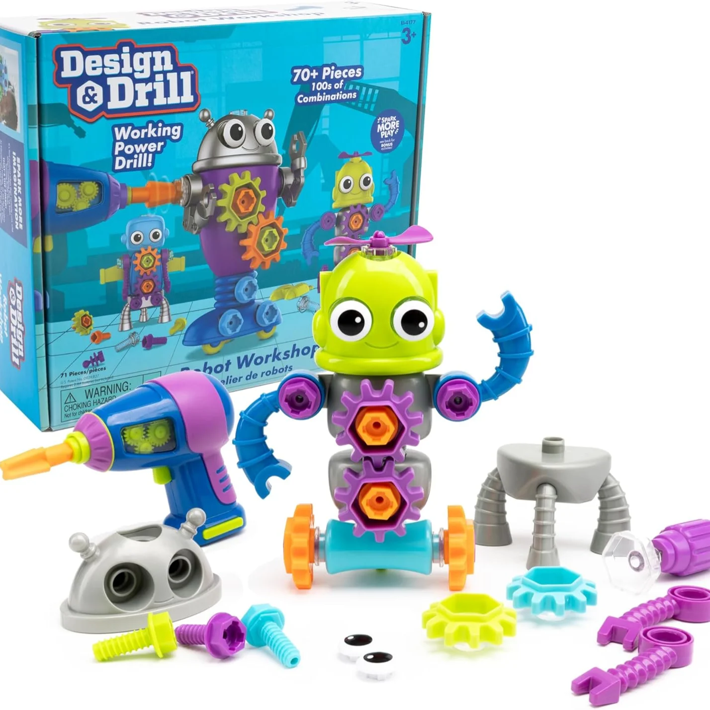 ● FINE MOTOR TOY INCLUDES: Kid-friendly drill, Phillips bit, screwdriver, gear socket bit, 32 bolts, 26 interchangeable pieces, seven gears, and sticker sheet. Ages 3+. Requires 2 AA batteries (not included). Drill U.S. Patent Number D929,837