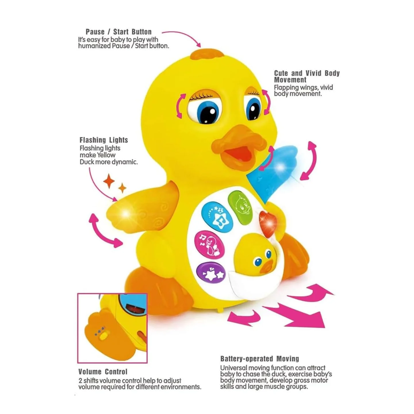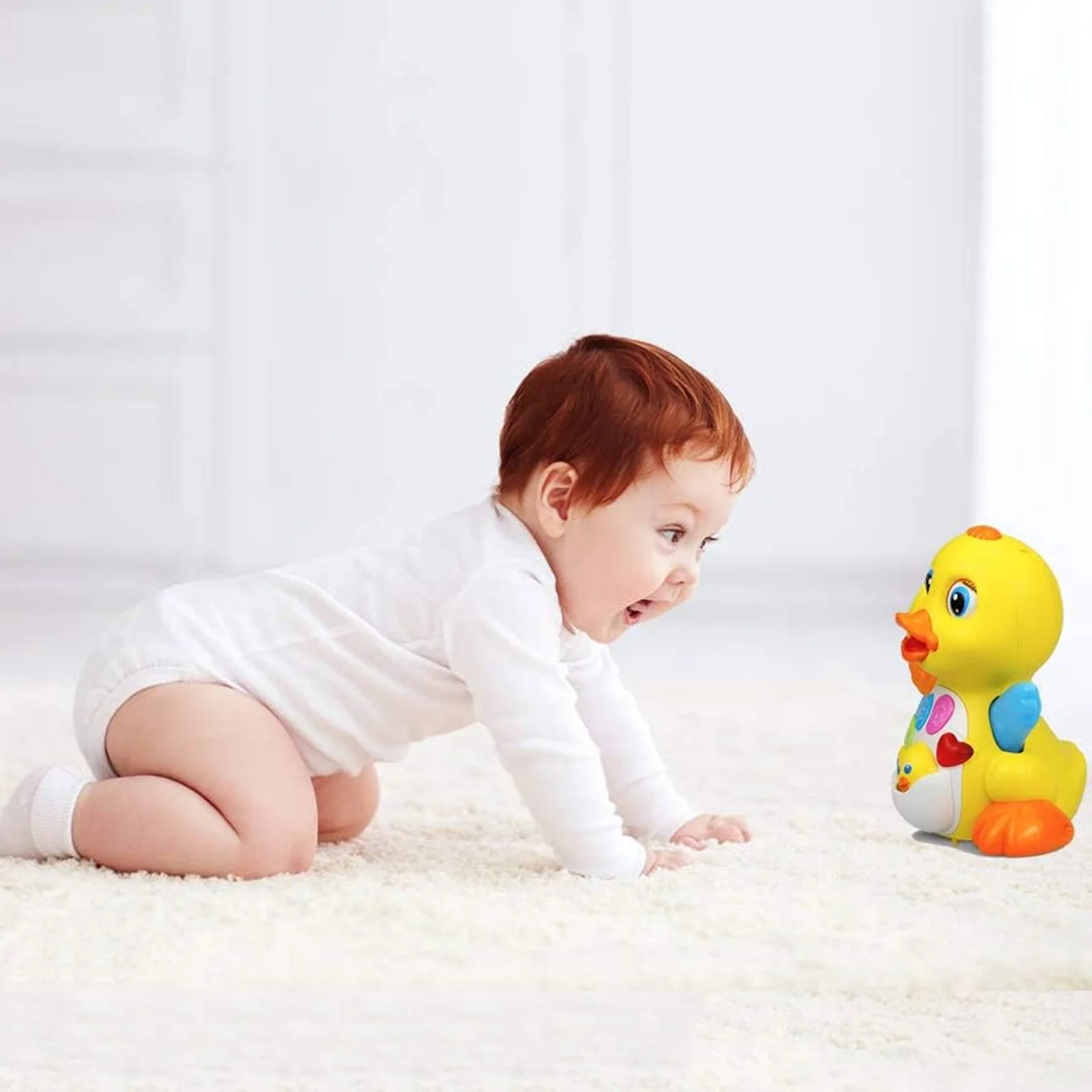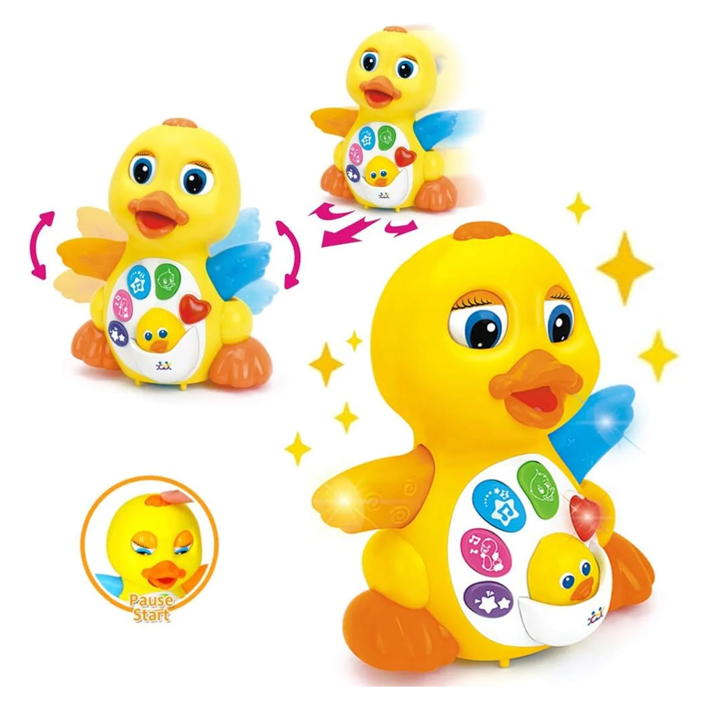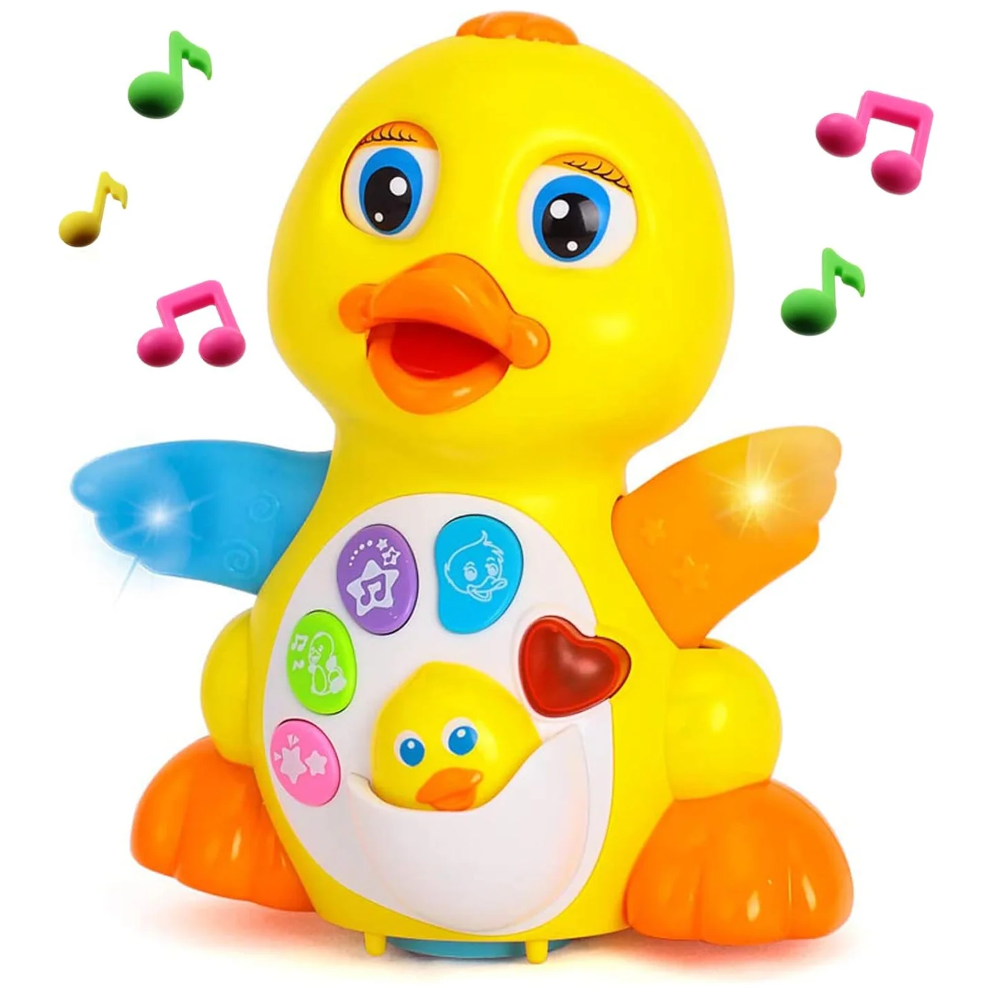● Fun Educational Learning Walking Toy: This Musical Duck Toy is smart and moves around, once it hits a wall it turns around and goes the other way. Baby would chase this adorable singing talking duck crawling. Push all the buttons, toddlers delight with it. The music is sweet - definitely not something that will drive a parent crazy, which is good, because kids could watch their musical dancing duck toy all afternoon.