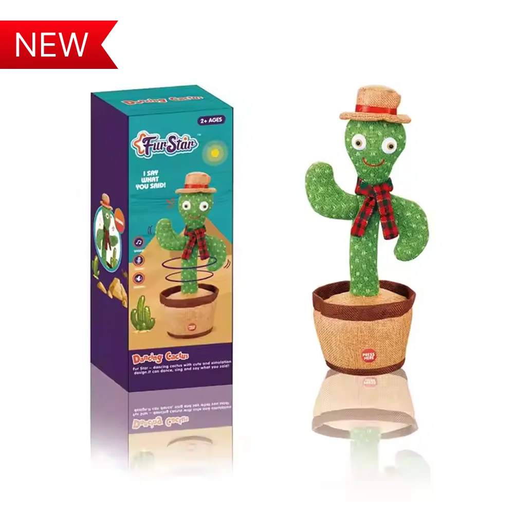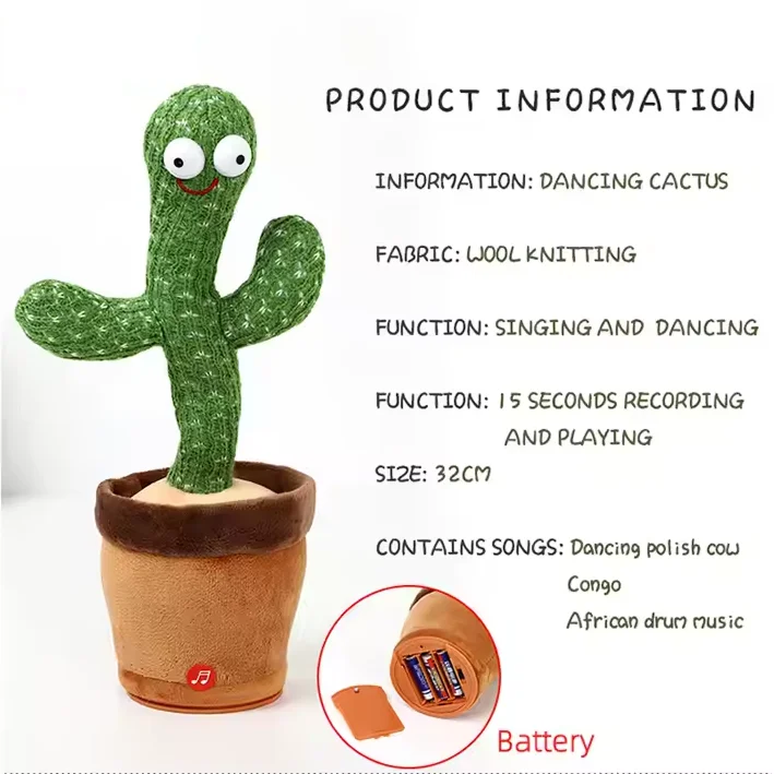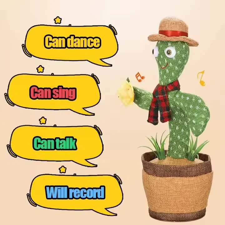 Bring endless fun and laughter with this adorable Singing & Dancing Cactus Toy! Packed with 120 songs, voice recording, and mimicking abilities, this animated toy is perfect for kids and adults alike. It sings, repeats what you say, dances with lights, and adds joy to any space!